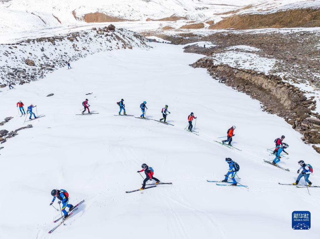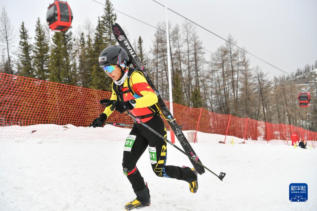 在新疆富蘊(yùn)縣可可托海國際滑雪度假區(qū),玉珍拉姆參加全國首屆滑雪登山冠軍賽短距離(女子組)比賽(4月8日攝)。新華社記者 胡虎虎 攝
