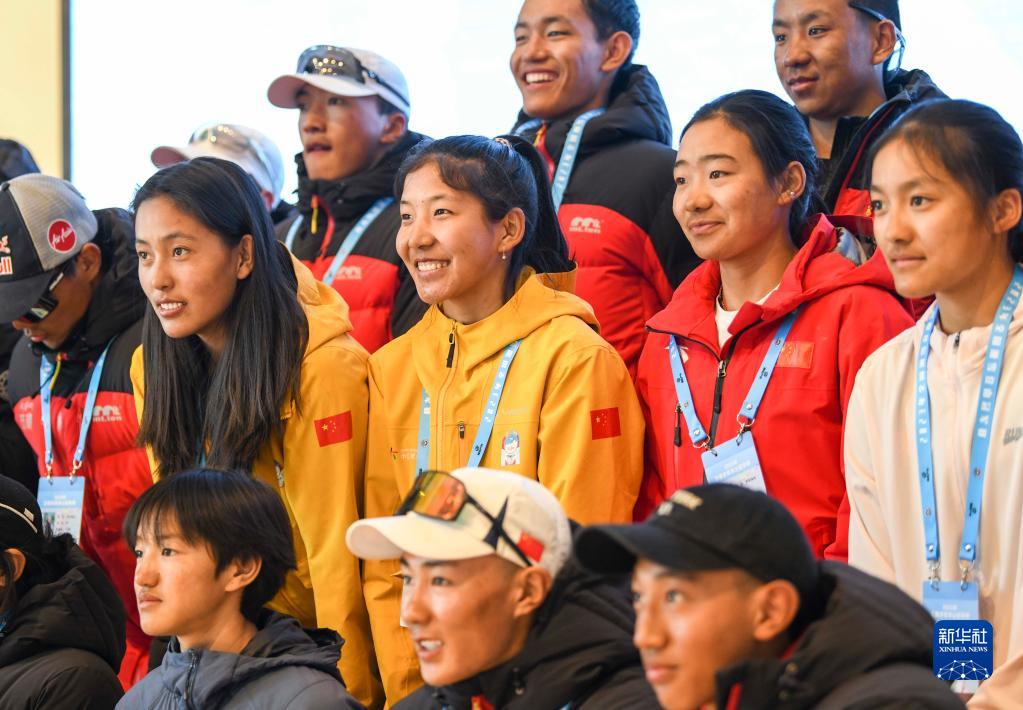 在新疆富蘊(yùn)縣,玉珍拉姆(中排右三)和參與全國首屆滑雪登山冠軍賽的西藏代表隊(duì)隊(duì)友合影留念(4月7日攝)。新華社記者 胡虎虎 攝