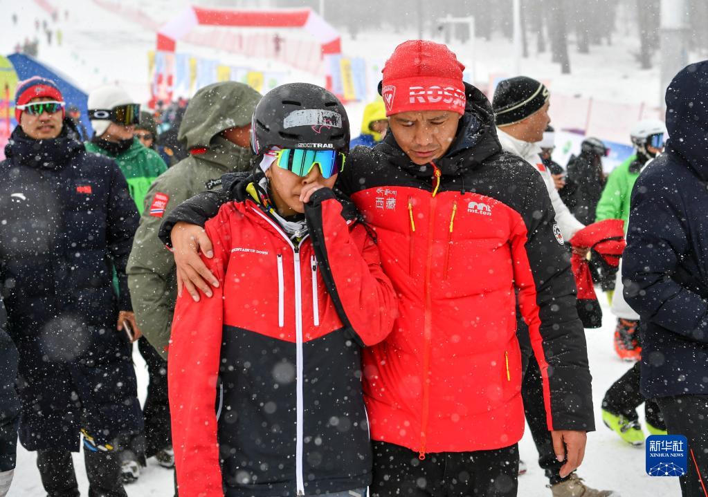 在全國首屆滑雪登山冠軍賽短距離(女子組)比賽后,西藏代表隊(duì)教練組人員安慰在比賽中失誤的玉珍拉姆(前左)(4月8日攝)。新華社記者 胡虎虎 攝