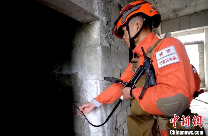 圖為演練中指戰(zhàn)員利用視頻生命探測儀搜索被困人員。西繞拉翁 攝