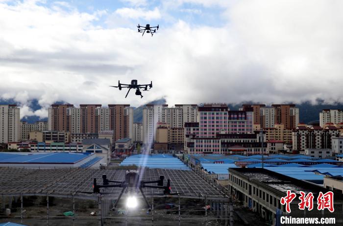 圖為演練中無人機(jī)正在進(jìn)行勘察喊話。西繞拉翁 攝