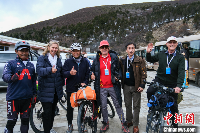 圖為5月17日,參訪團(tuán)成員在林芝魯朗觀景臺(tái)與騎行國道318線的旅行者合影。 中新社記者 江飛波 攝