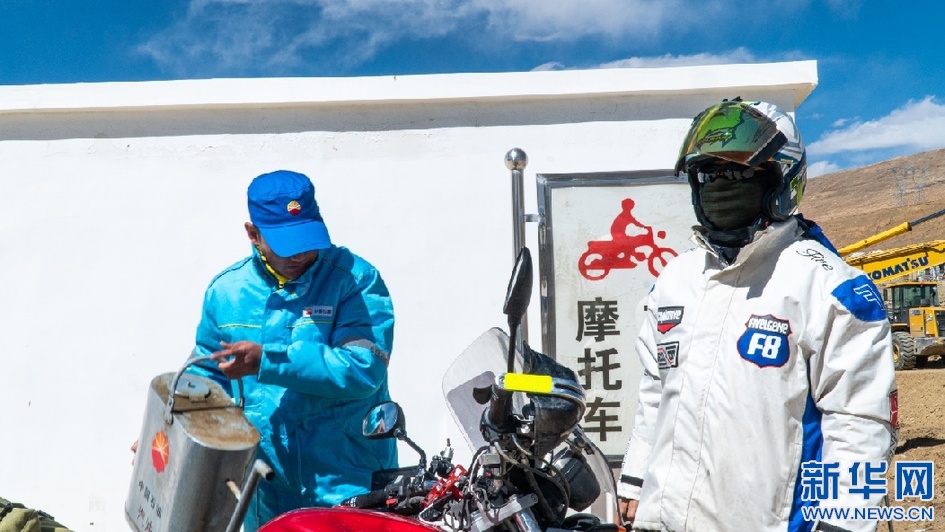 邊巴頓珠正在為游客的摩托車(chē)加油(5月16日攝) 。新華網(wǎng)發(fā) 洛桑旺堆 攝