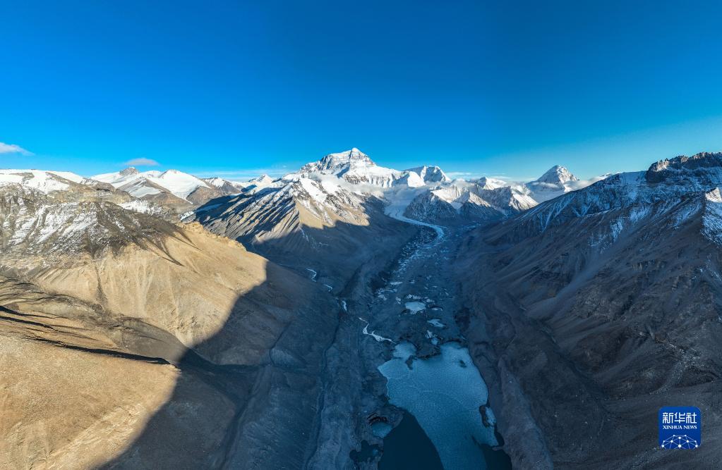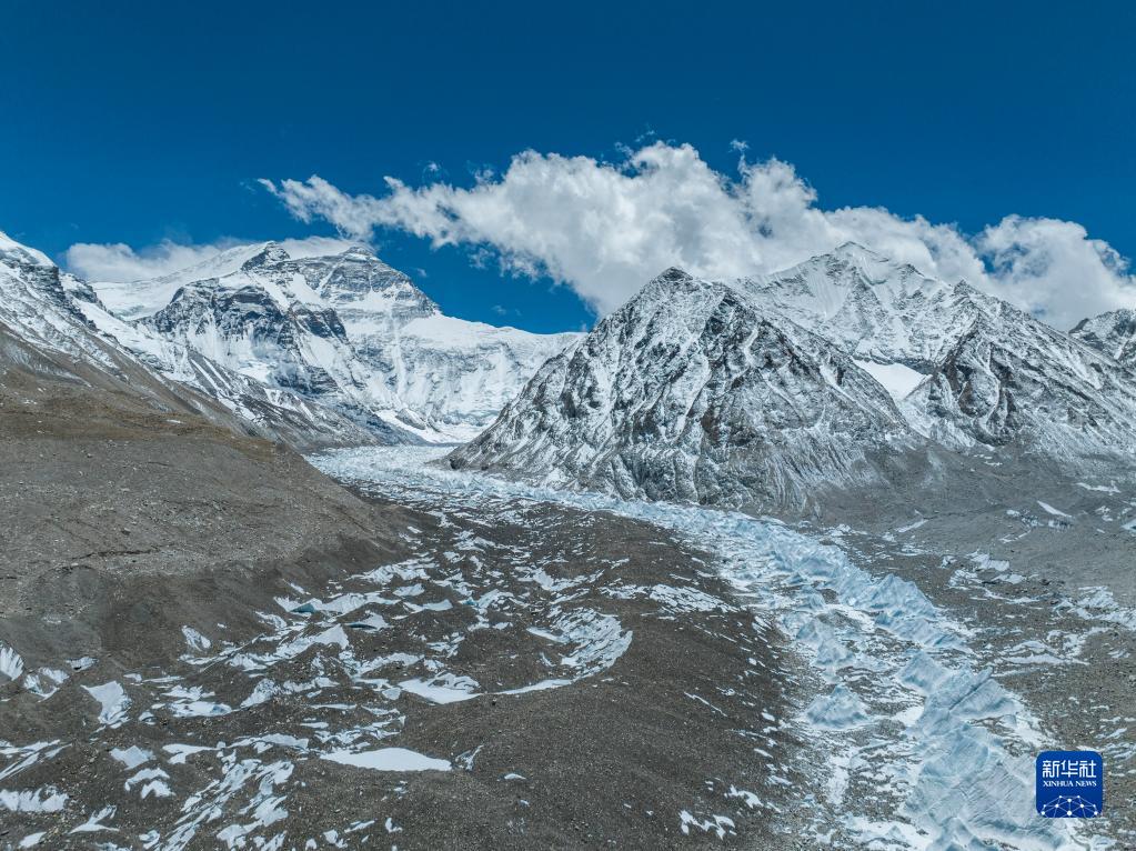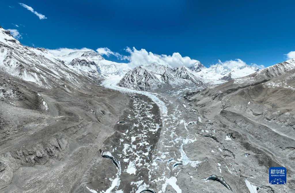 這是珠峰腳下的中絨布冰川(前)和西絨布冰川(后)(5月15日攝,無(wú)人機(jī)照片)。新華社記者 孫非 攝