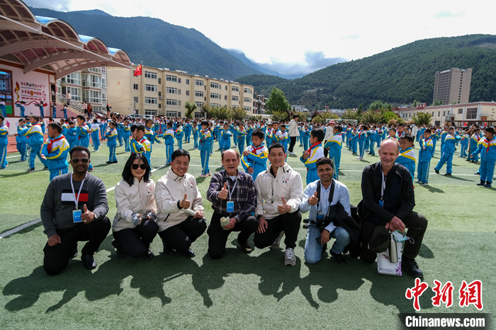 圖為5月18日上午,參訪團成員與林芝市第二小學(xué)老師們合影。中新社記者 江飛波 攝