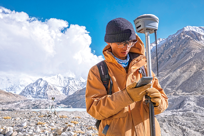 來自中國科學(xué)院西北生態(tài)環(huán)境資源研究院的科考隊員薛雨昂在對冰川進行實時差分GPS定位(5月15日攝)。新華社記者晉美多吉攝