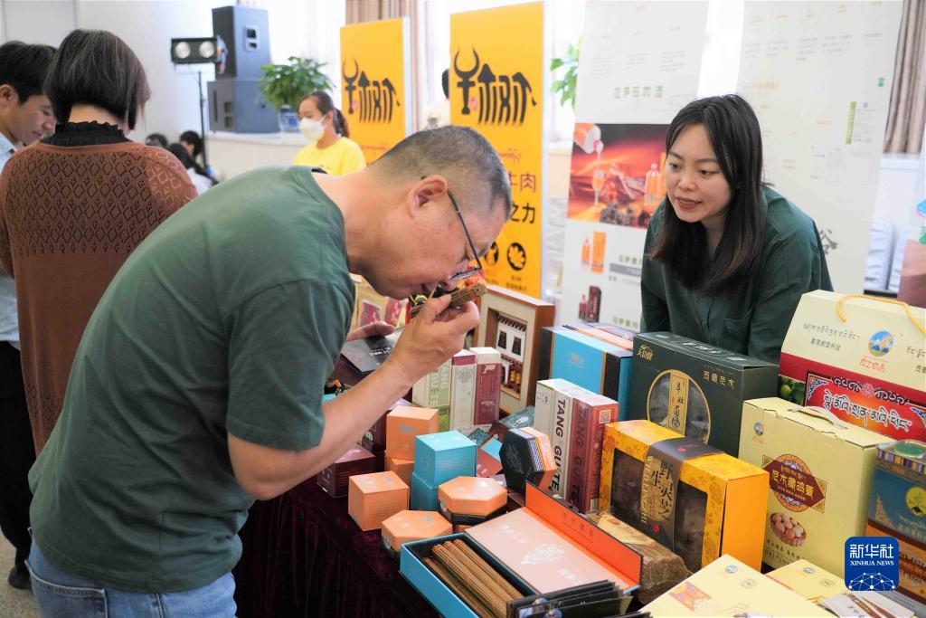 5月26日,推介會(huì)現(xiàn)場(chǎng)的工作人員為參觀者介紹西藏特色產(chǎn)品。新華社發(fā)(王靜頤攝)