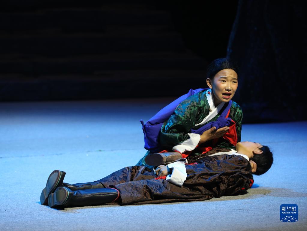 13歲的小演員旦增夢朗身著深綠色藏戲服飾,跪在舞臺(tái)中央,眼角噙淚,緊摟著失去意識(shí)的弟弟……低沉、哀慟的藏戲唱腔,舞臺(tái)兩側(cè)實(shí)時(shí)滾動(dòng)的字幕,看哭了不少觀看試演的觀眾。
