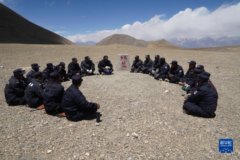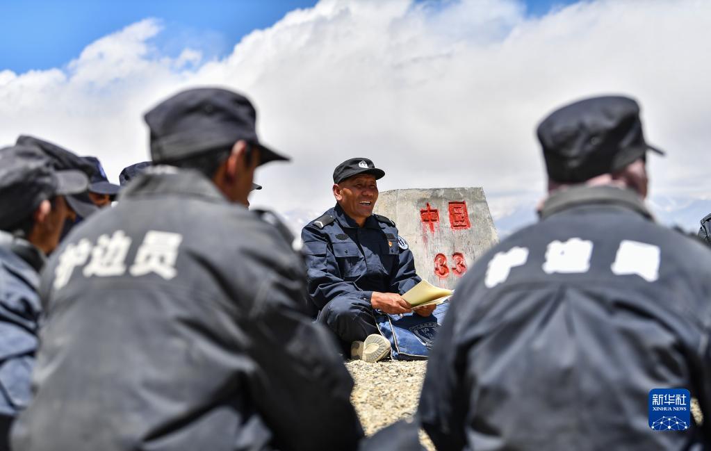6月2日,在33號界樁處,護(hù)邊聯(lián)防隊(duì)在隊(duì)長石角(右二)的帶領(lǐng)下學(xué)習(xí)。新華社記者 晉美多吉 攝