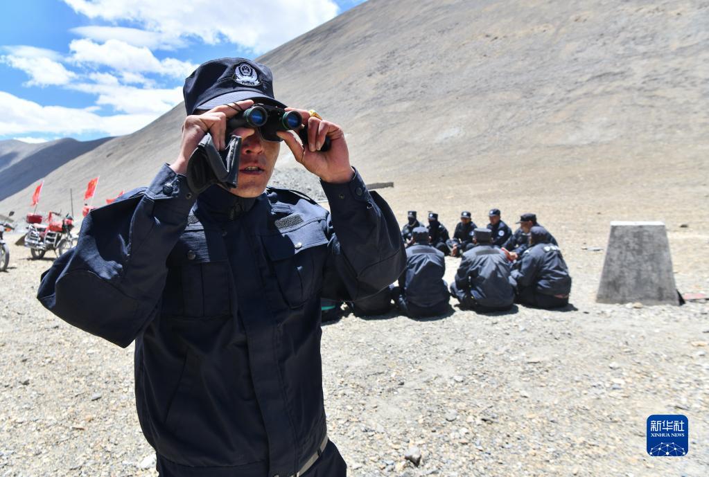 6月2日,在33號界樁處,一名護(hù)邊聯(lián)防隊(duì)隊(duì)員使用望遠(yuǎn)鏡巡查。新華社記者 晉美多吉 攝