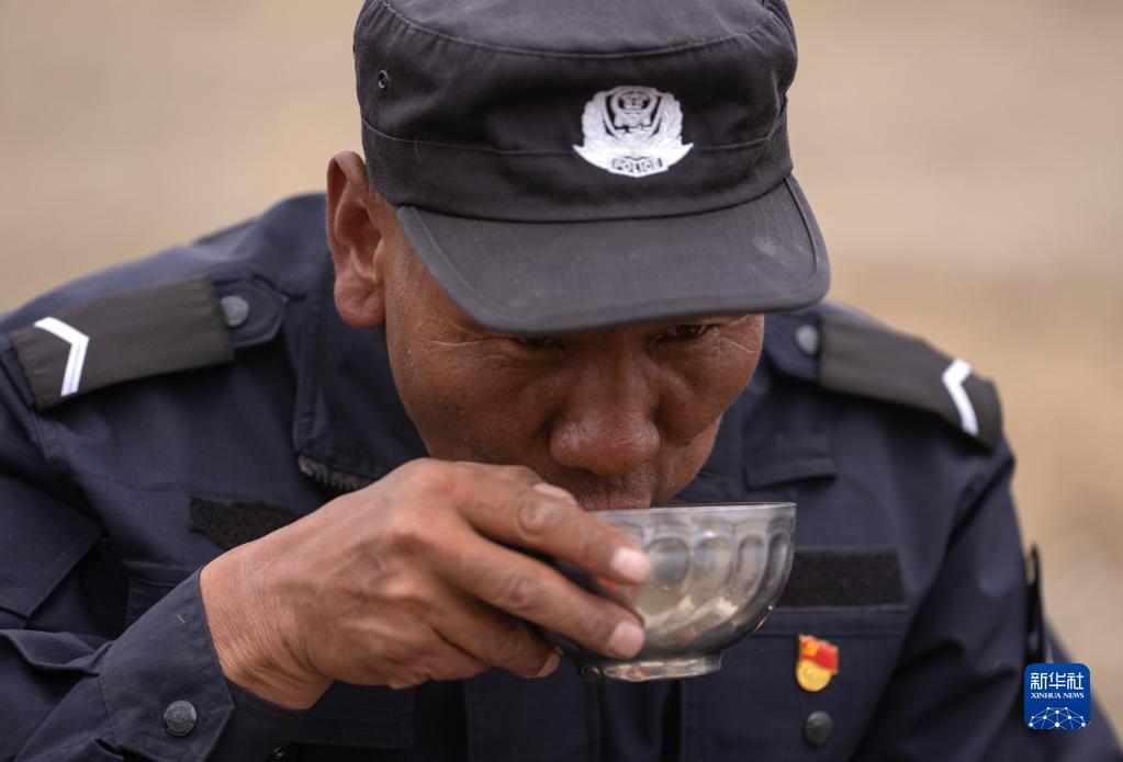 6月2日,午餐時間,石角在喝酥油茶。新華社記者 費(fèi)茂華 攝