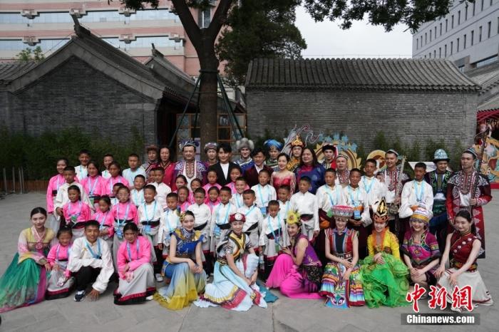 6月1日,來自青海省玉樹藏族自治州兒童福利院的40名藏族青少年參觀中華民族共同體體驗館。圖為孩子們與參加演出的多民族藝術(shù)家們合影。中新社記者 崔楠 攝