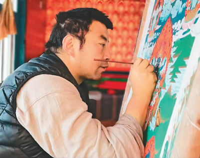 象雄唐卡畫家嘎松旺加在繪畫唐卡。據(jù)介紹,唐卡畫風(fēng)的傳承最早可追溯到古象雄時(shí)期,其佛像繪制主要依據(jù)了《古象雄大藏經(jīng)》中的度量法。