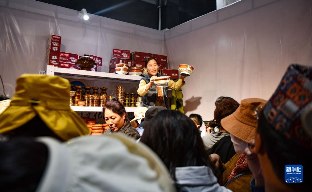 在藏博會(huì)上,來自西藏昌都市的參展商(左)向顧客推介產(chǎn)品(6月17日攝)。新華社記者 張汝鋒 攝