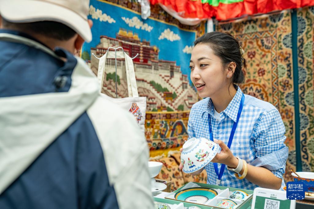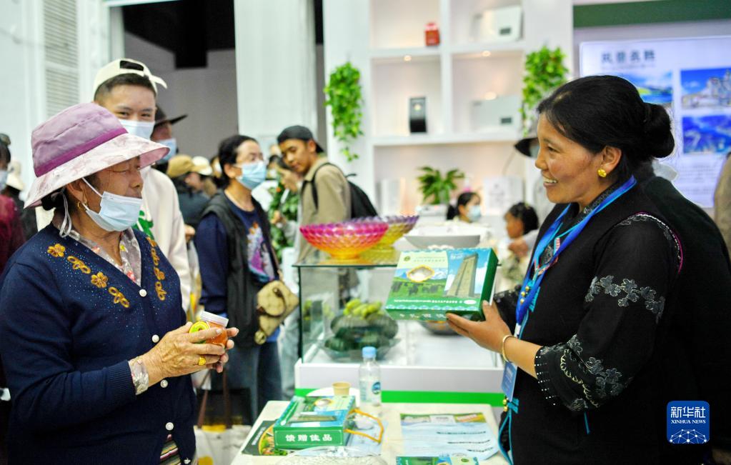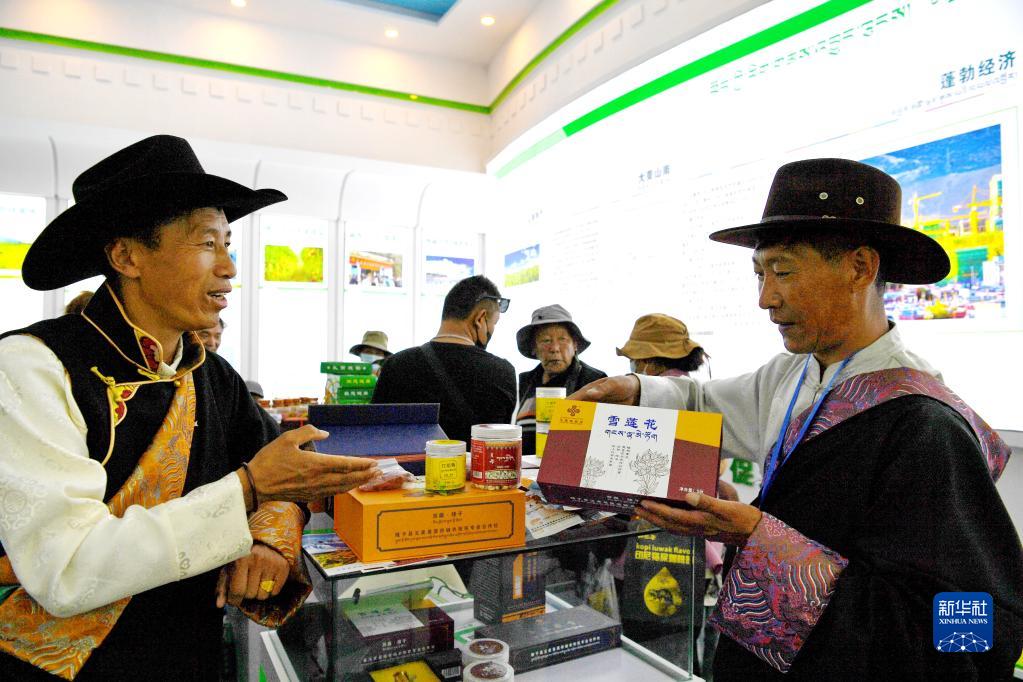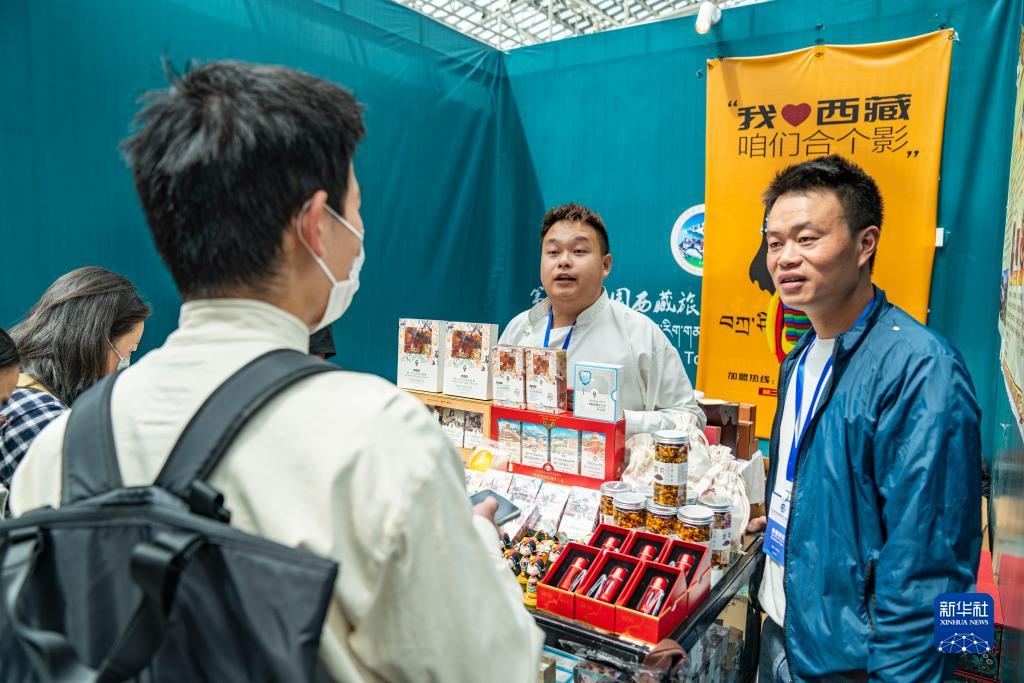在藏博會(huì)上,參展商(右)向顧客介紹西藏特產(chǎn)(6月17日攝)。新華社記者 張汝鋒 攝