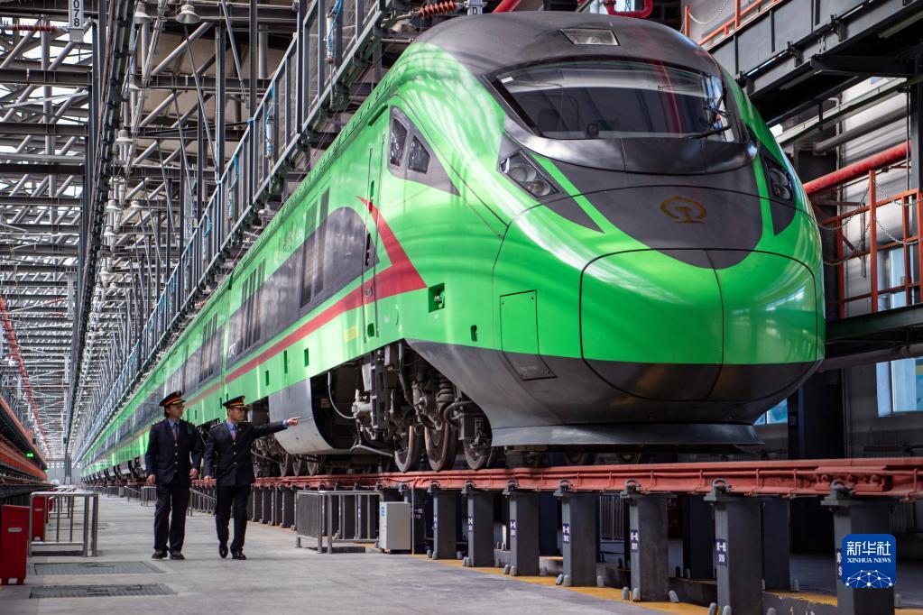 在拉薩機輛整備中心,“復(fù)興號”動車組在檢修庫進(jìn)行整備作業(yè)(1月11日攝)。新華社記者 孫非 攝