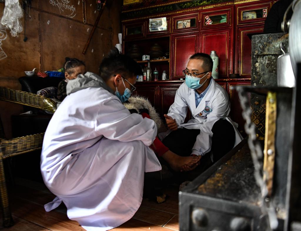 在米林的叢林中,珠海市人民醫(yī)院的援藏醫(yī)生王振疆手捧著病人的腳,仔細(xì)詢問病人的身體狀況,送去了援藏省市的關(guān)心,送去了藏漢一家親的問候。