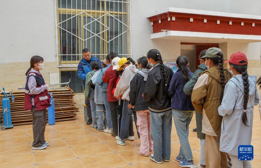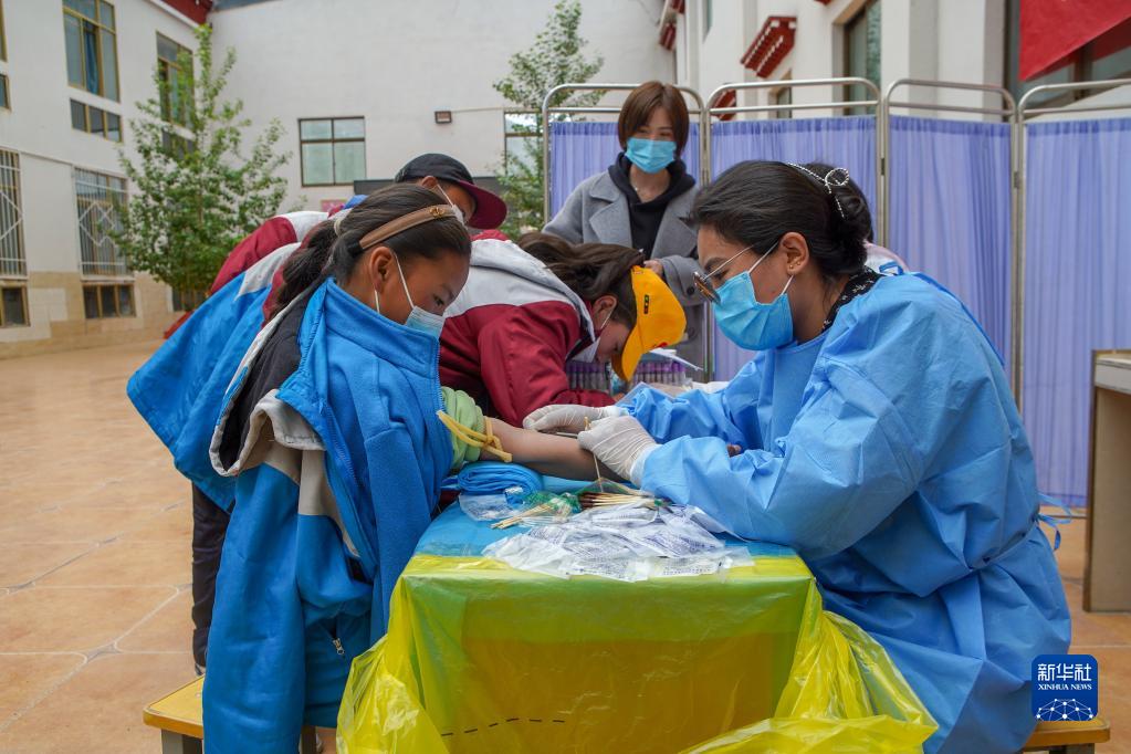 7月4日,那曲市色尼區(qū)適齡兒童、青少年排隊等待做心臟聽診。新華社記者 邵澤東 攝