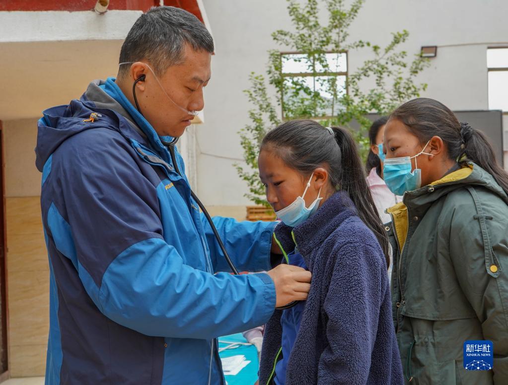 7月4日,“心佑工程”項目發(fā)起人耿直醫(yī)生給被篩查兒童做心臟聽診。新華社記者 邵澤東 攝