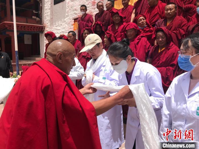 “同心·共鑄中國(guó)心”2023西藏昌都行大型醫(yī)療公益活動(dòng)正在昌都舉行。當(dāng)天,來(lái)自首都醫(yī)科大學(xué)附屬北京佑安醫(yī)院、北京老年醫(yī)院、北京大學(xué)首鋼醫(yī)院的醫(yī)療專(zhuān)家來(lái)到邊壩寺開(kāi)展免費(fèi)義診、愛(ài)心物資捐贈(zèng)等活動(dòng)。專(zhuān)家們抵達(dá)寺廟后,僧眾和邊壩寺管委會(huì)工作人員為他們獻(xiàn)上了哈達(dá)。