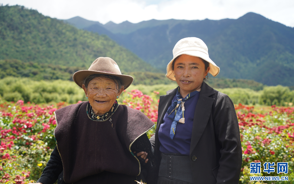 7月22日,前來(lái)“工布花谷”賞花的索朗卓瑪母女。新華網(wǎng)發(fā) 旦增晉扎 攝