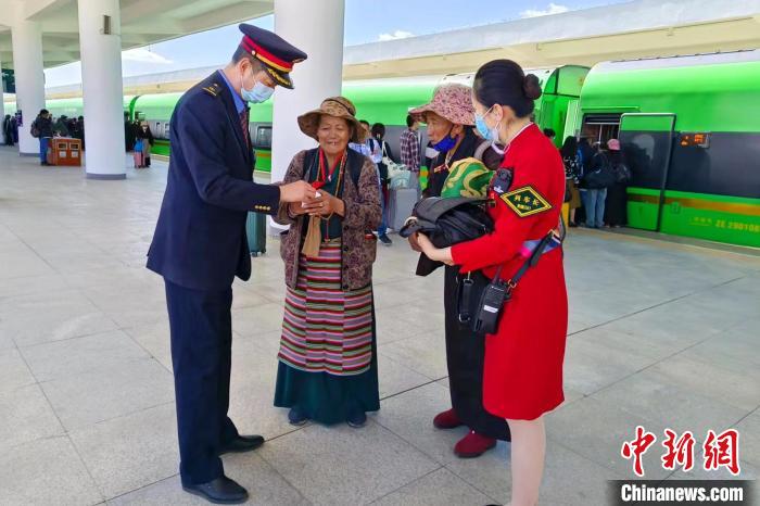 圖為日喀則火車(chē)站工作人員服務(wù)旅客。拉薩車(chē)務(wù)段 供圖