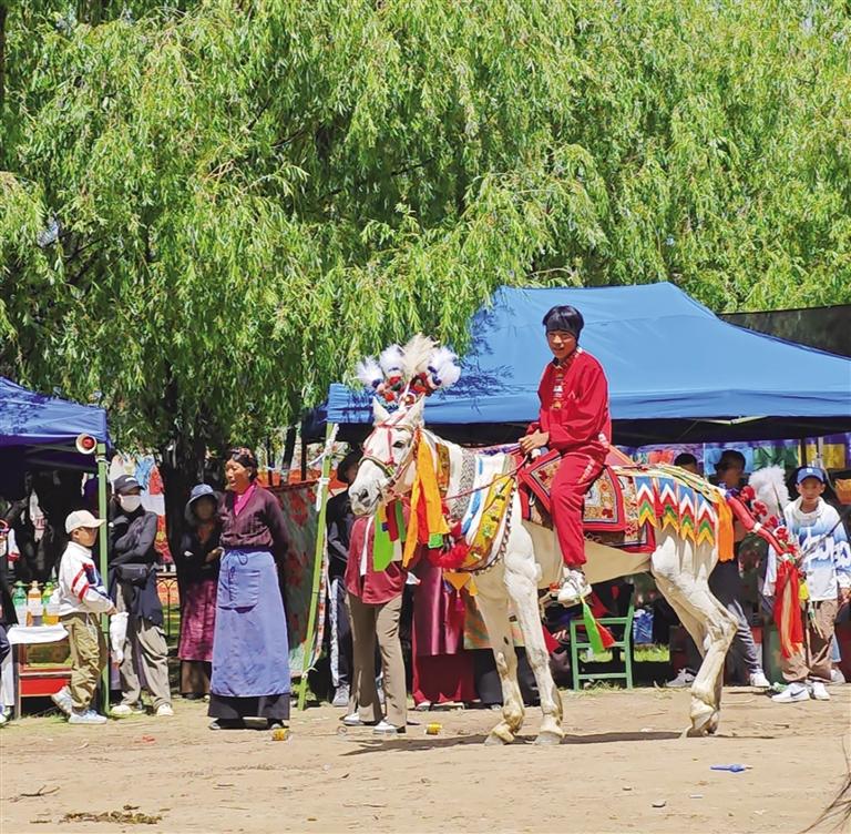 賽場上,幾個稚嫩的小伙子引起了大家的注意。他們熟練地跳上馬背、抓緊韁繩、目光堅(jiān)定?!巴郏√袅?!”“媽媽,那個哥哥拿到了哈達(dá)!”……只見16歲的單增阿旺策馬奔騰,俯身拾起地上的綠色哈達(dá),獲得大家的陣陣掌聲。“我從小就很喜歡騎馬,除了去年因?yàn)閷W(xué)業(yè)緊張,沒能參加賽馬表演,往常每年都會參加。”單增阿旺說。