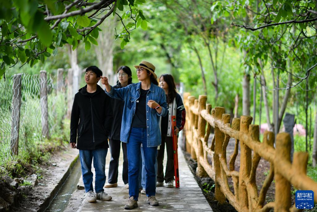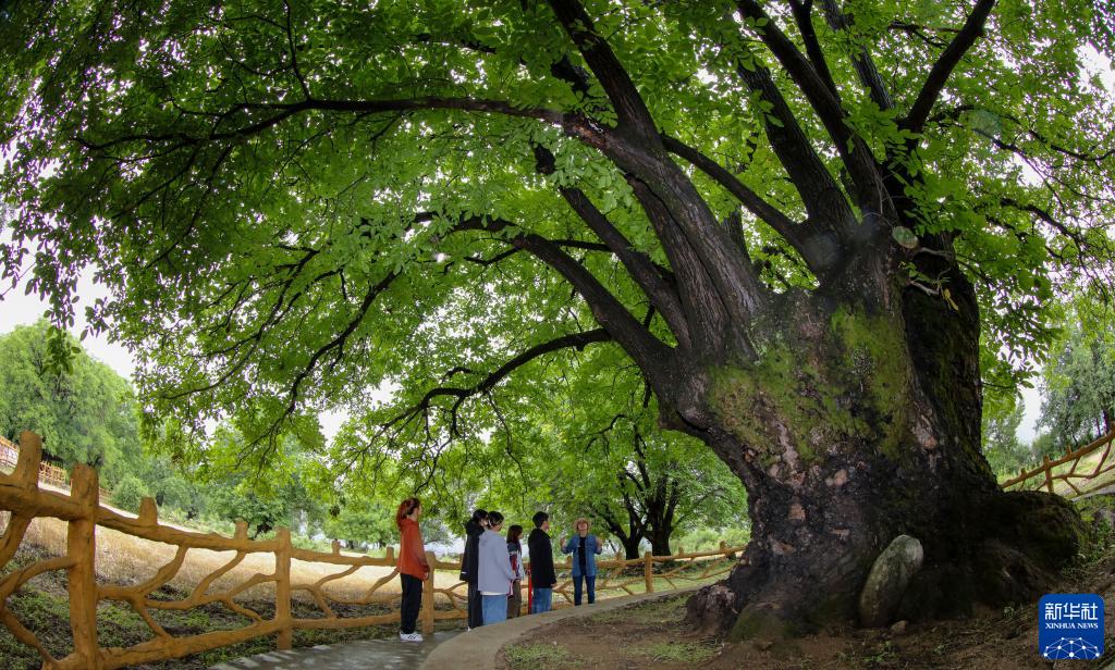劉利平博士(右一)在加查縣安繞鎮(zhèn)熱果村一株樹齡1800余年的古核桃樹下指導(dǎo)學(xué)生(7月27日攝)。新華社記者 姜帆 攝