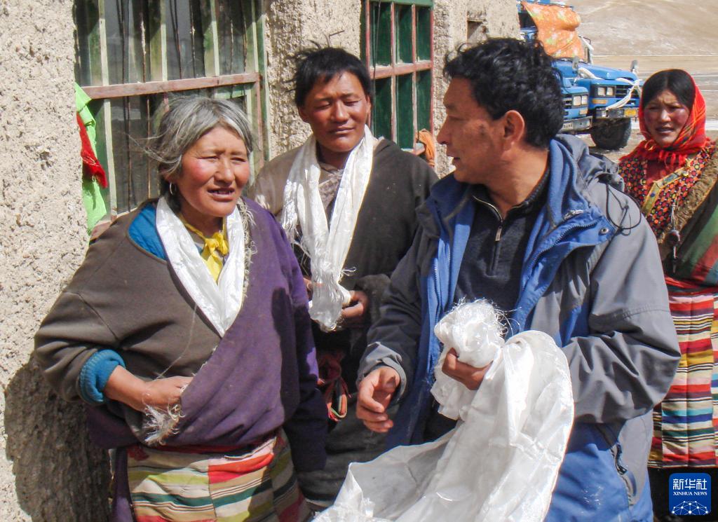 在西藏那曲市申扎縣曲松普村駐村期間,邊巴(前右)到群眾家中慰問(資料照片)。新華社發(fā)(受訪者供圖)