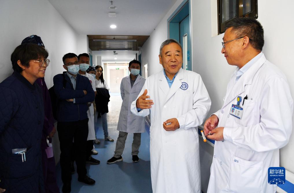8月10日,中國科學院院士、首都醫(yī)科大學附屬北京天壇醫(yī)院神經(jīng)外科學中心主任醫(yī)師趙繼宗(右二)和西藏第二人民醫(yī)院的醫(yī)生在醫(yī)院病房走廊里交流。新華社記者 張汝鋒 攝