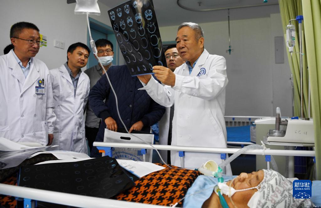 8月10日,中國科學院院士、首都醫(yī)科大學附屬北京天壇醫(yī)院神經(jīng)外科學中心主任醫(yī)師趙繼宗(左三)和北京天壇醫(yī)院神經(jīng)外科學中心主任醫(yī)師仇漢誠(左二)進行教學查房。新華社記者 張汝鋒 攝