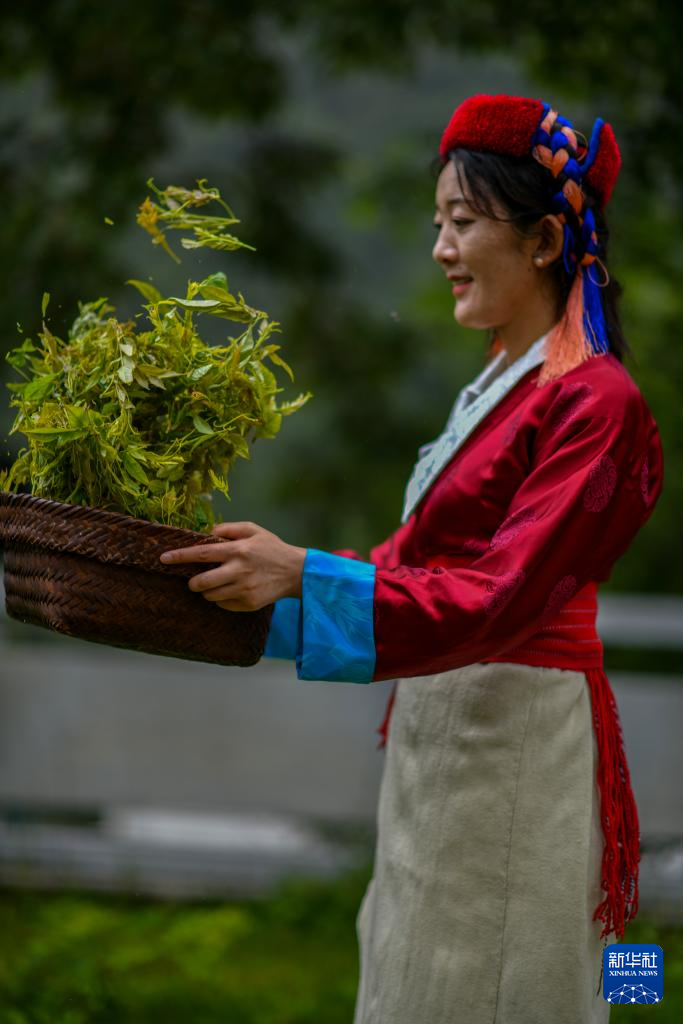 尼瑪卓瑪在處理采摘到的莓茶(7月29日攝)。新華社記者 姜帆 攝