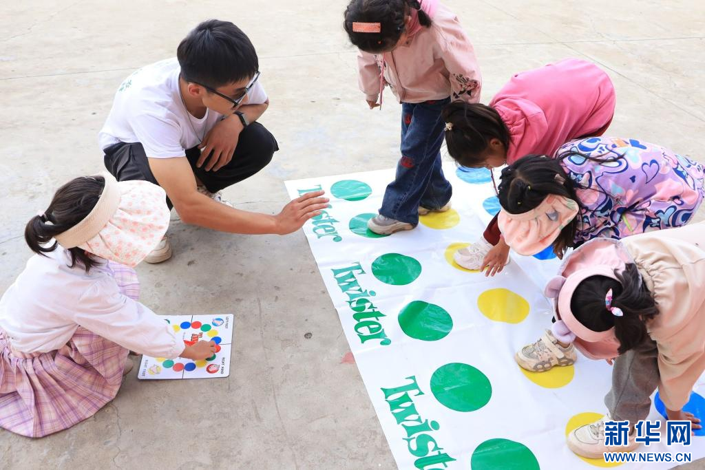 中國農(nóng)業(yè)大學峰云社人文科考隊隊員帶領(lǐng)孩子們進行課外活動。新華社發(fā)