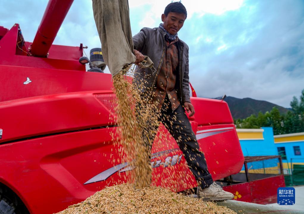 8月24日,乃東區(qū)的農(nóng)民在用聯(lián)合收割機收獲青稞。