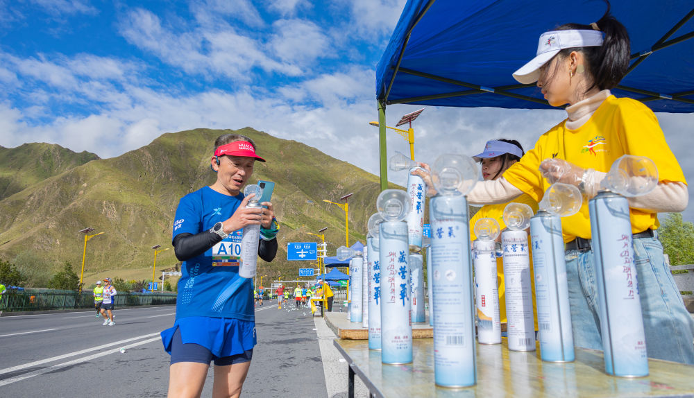 馬拉松愛好者正在領(lǐng)取氧氣罐。新華社發(fā)(丁增尼達 攝)