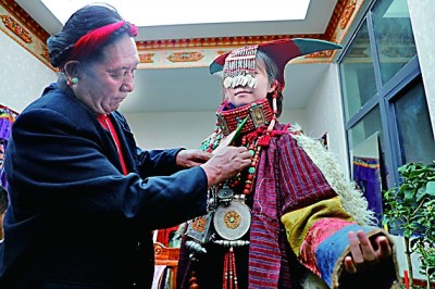 眾多的藝術形式當然也會催生出絢爛多彩、雍容華貴的普蘭服飾,其中最有名的當數普蘭“宣”服(又稱飛天服),單是穿戴這套服飾就要用一個多小時。地處貿易要道的普蘭人,將遙遠的珊瑚、黃金、蜜蠟、白銀、綠松石、珍珠全都裝飾在“宣”服上,展示著對這襲錦袍的無比珍視。家族世代傳承“宣”服制作技藝的才旺多吉現(xiàn)在不僅把技藝公開傳授,每年單靠制作“宣”服,純收入就能達到四五萬元,而且通過普蘭的邊貿市場,這些服飾還能賣到尼泊爾和印度。