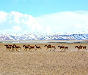 普蘭縣境內奔跑在雪山下的成群藏野驢。劉曉東攝/光明圖片