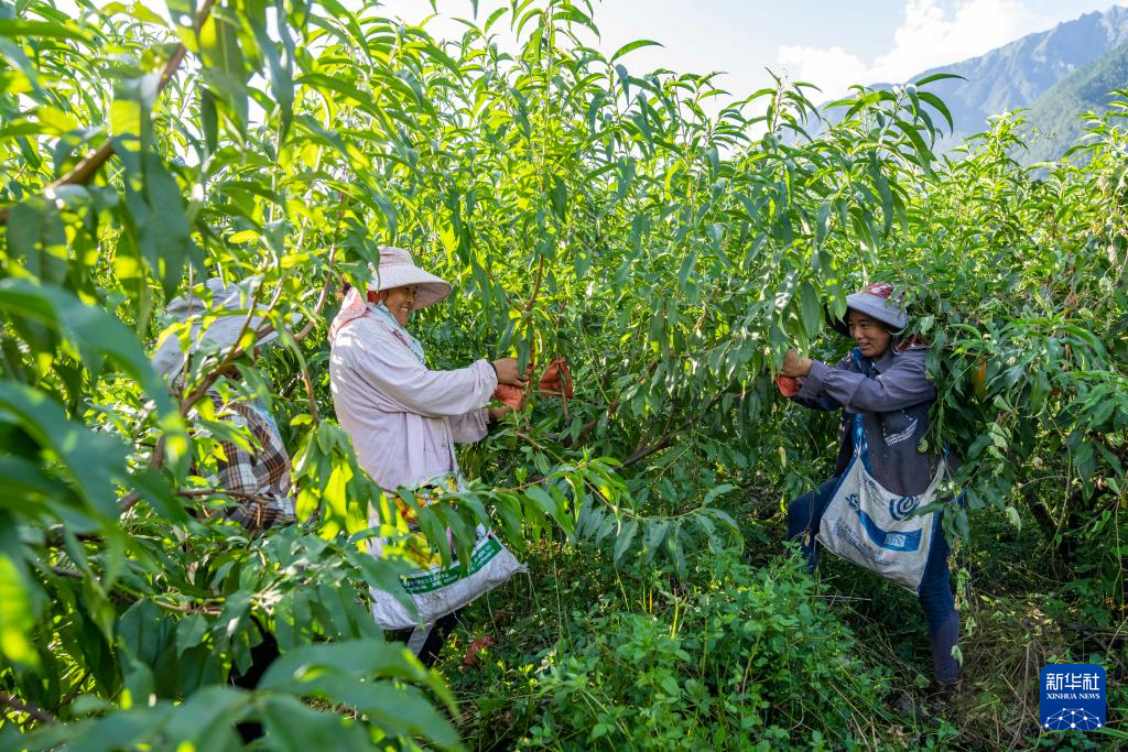 在西藏察隅縣下察隅鎮(zhèn),當地村民正在采摘黃桃(9月3日攝)。新華社記者 孫非 攝