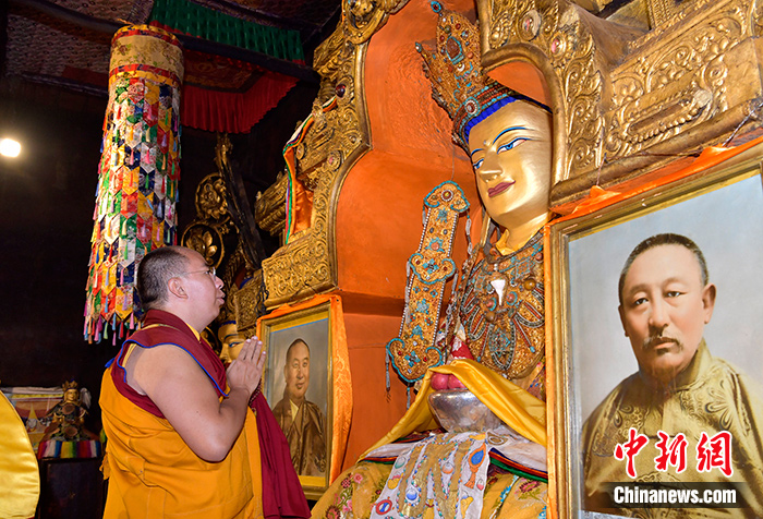 9月12日,班禪在扎什倫布寺措欽大殿朝拜佛祖釋迦牟尼佛像。中新社記者 李林 攝