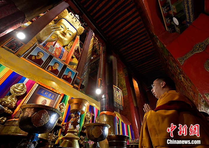 9月13日,班禪在扎什倫布寺強(qiáng)巴佛殿朝拜強(qiáng)巴佛。中新社記者 李林 攝