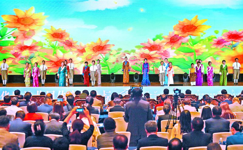 9月19日,由自治區(qū)黨委、自治區(qū)政府主辦的首屆西藏鑄牢中華民族共同體意識論壇在拉薩開幕。圖為在開幕式上,西藏珠峰少年合唱團(tuán)演唱《珞巴少年》。記者 潘多 攝