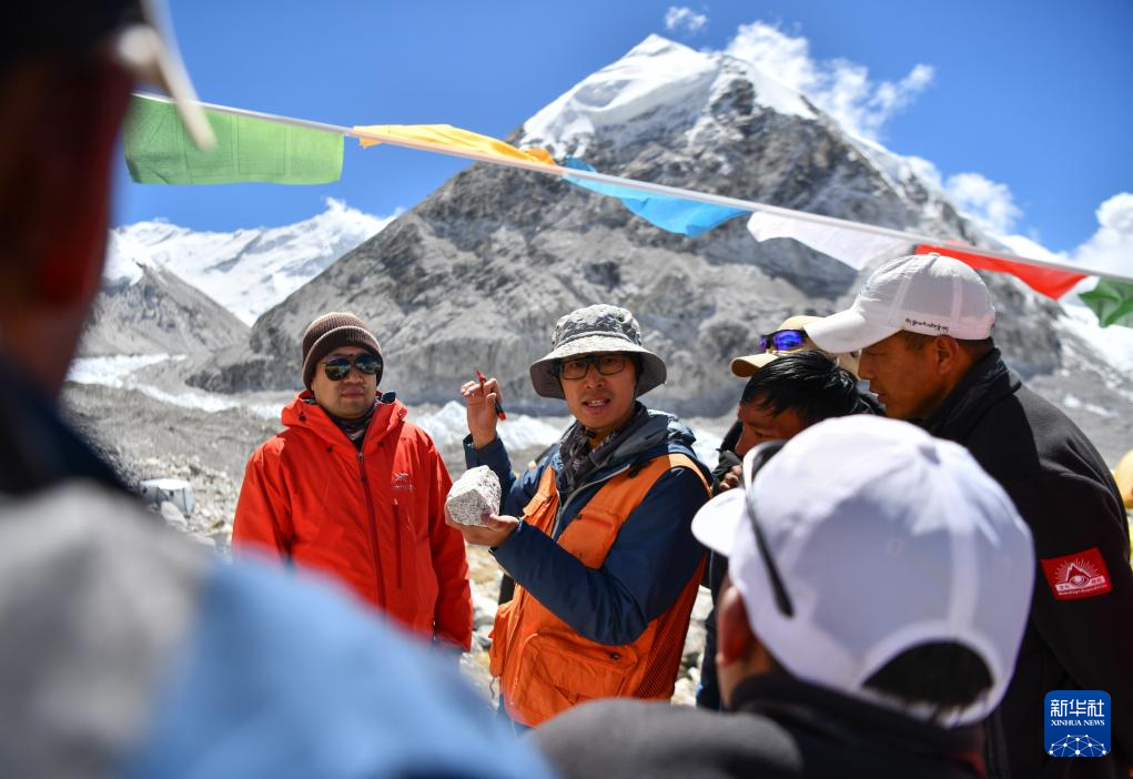 科考隊(duì)隊(duì)員褚楊(左三)在為西藏登山隊(duì)隊(duì)員講解如何采集峰頂至前進(jìn)營(yíng)地的巖石樣本(9月27日攝)。新華社記者 晉美多吉 攝