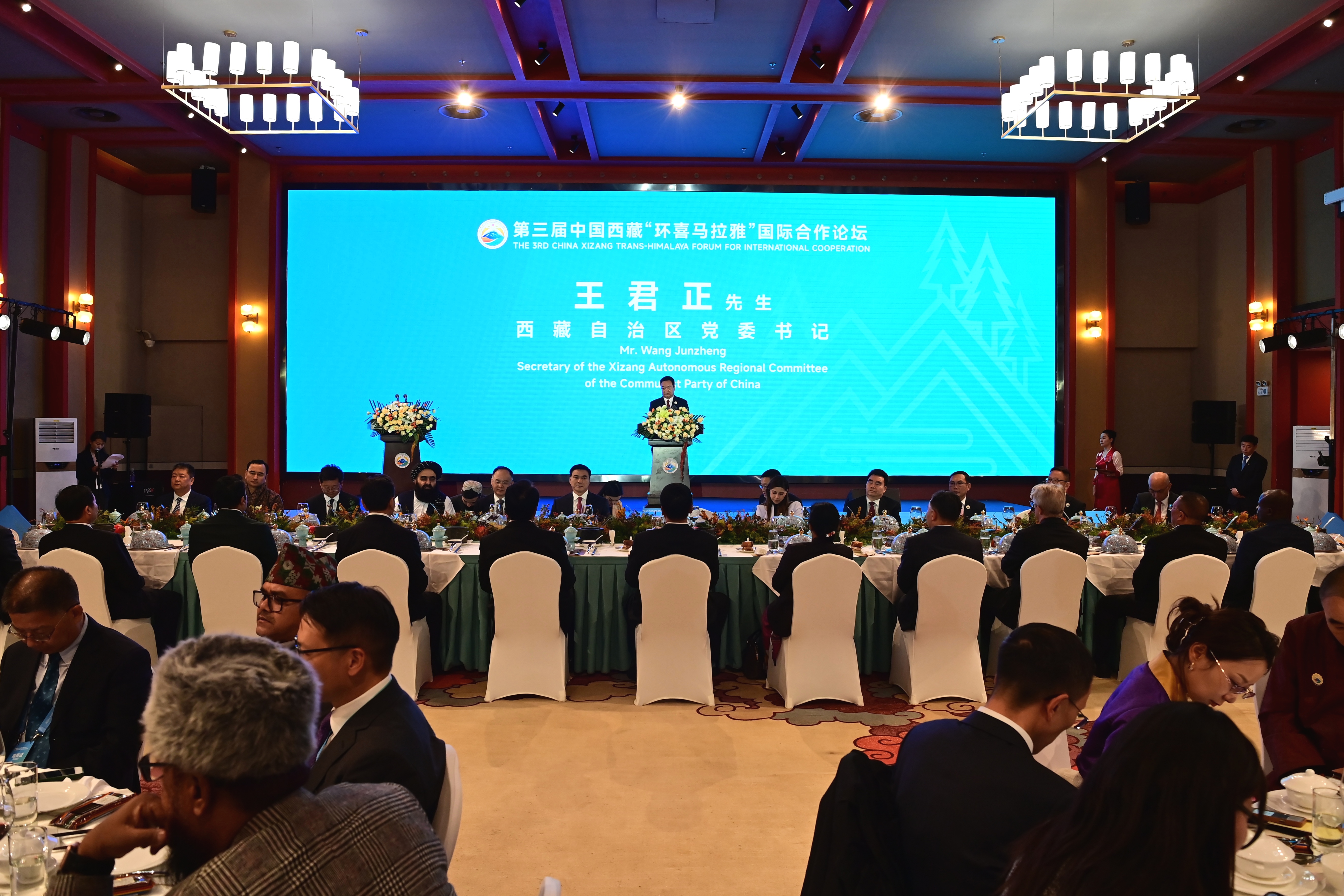 10月4日晚,第三屆中國西藏“環(huán)喜馬拉雅”國際合作論壇在林芝魯朗舉行歡迎招待會。這是自治區(qū)黨委書記王君正出席并致辭。記者 旦增西旦 攝