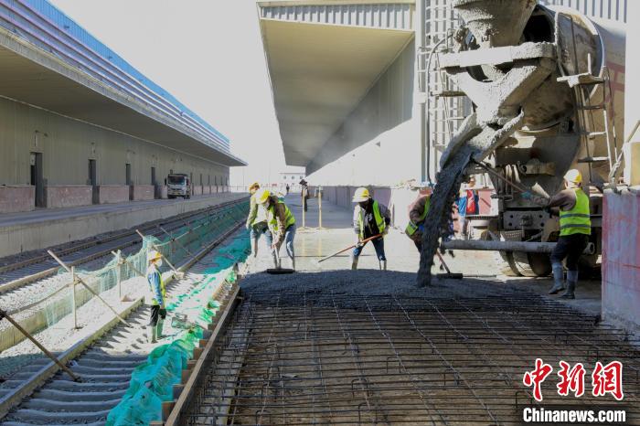 圖為西藏那曲物流園區(qū)綜合5站臺(tái)大修施工現(xiàn)場(chǎng)進(jìn)行混凝土澆筑作業(yè)。馬生明 攝