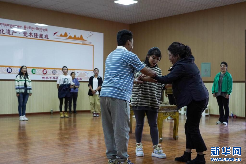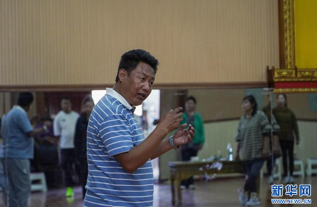 “像這樣,動作幅度大一點,我們再來一次?!迸啪毷依铮鞑刈灾螀^(qū)級非物質(zhì)文化遺產(chǎn)傳承人、覺木隆藏戲傳承人洛桑扎西正糾正演員們的動作,伴隨著有力的鼓點,藏戲《白瑪文巴》的排練正在進行。