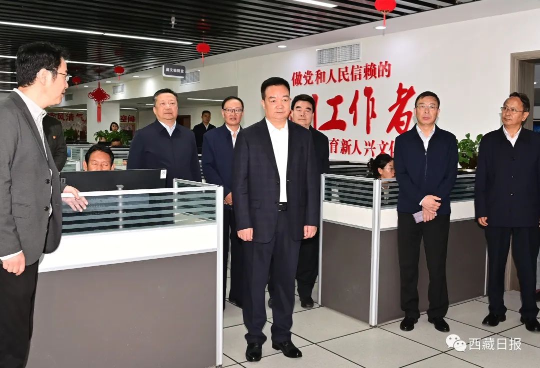 2023年9月25日,自治區(qū)黨委書記王君正來到西藏日?qǐng)?bào)社、西藏廣播電視臺(tái)調(diào)研。這是王君正在西藏日?qǐng)?bào)社詳細(xì)了解市場(chǎng)化運(yùn)營、全媒體傳播體系建設(shè)、媒體深度融合發(fā)展等情況。記者 旦增西旦 攝