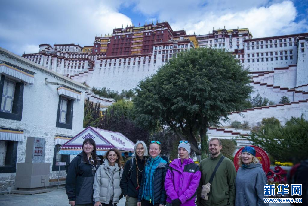 10月18日,外國游客在布達拉宮前合影留念。新華網 旦增努布 攝
