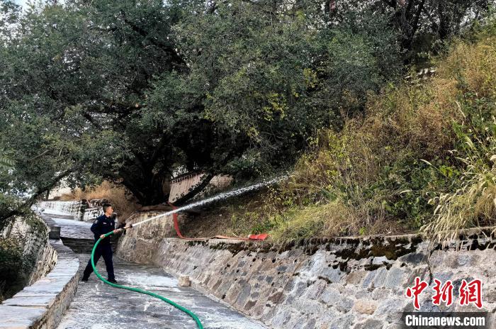 冬季來(lái)臨天氣干燥,為杜絕墻體粉刷過(guò)程中因意外引燃山體雜草,造成不可挽回的損失,在墻體粉刷正式開(kāi)始前一周,大隊(duì)每日清晨、傍晚組織指戰(zhàn)員對(duì)布達(dá)拉宮山體進(jìn)行全面濕化,消除火災(zāi)隱患,濕化累計(jì)用水200余噸。