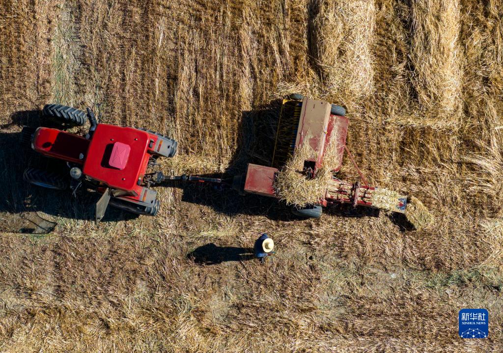 10月24日,村民駕駛農(nóng)機(jī)在拉薩市林周縣強(qiáng)嘎鄉(xiāng)曲嘎強(qiáng)村將收割過(guò)的牧草打包(無(wú)人機(jī)照片)。新華社記者 姜帆 攝