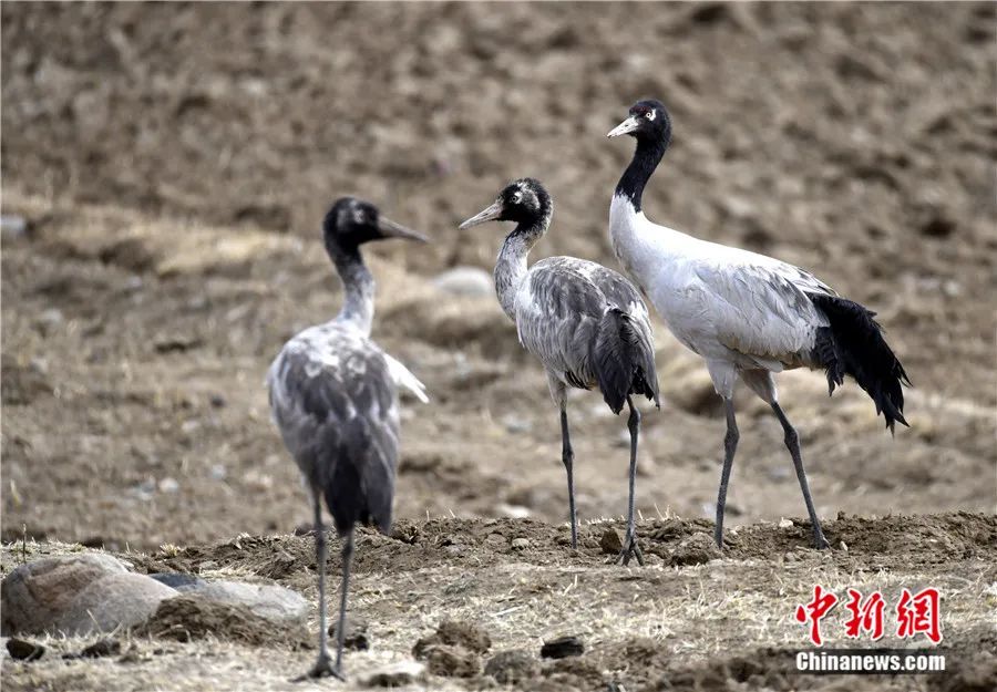 國(guó)家一級(jí)重點(diǎn)保護(hù)野生動(dòng)物黑頸鶴在西藏拉薩楚布溝的農(nóng)田覓食。李林 攝
